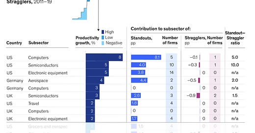 Very interesting indeed from the Jan Mischke-led MGI team. In leading technological-frontier economies, real economic growth and change may well come in seismic bursts, often led by a single company. The story appears to be not one of slow diffusion, but of a handful of risk-takers dragging the rest of us, often unwillingly, into the more productive future. What does this mean for policy, wages, and the future of economic dynamism?…