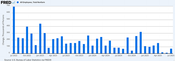 Well, well, well: seasonally-adjusted, payroll employment in July was no higher than we had thought yesterday it had been in June. Our estimate of the June level has been revised down by 21,000—yes, the last report that maddened Trump was more optimistic than it looks now like the situation warranted. And the seasonally-adjusted gain from June to July was only 22,000:
