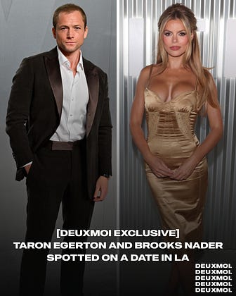 Sources confirm to Deuxmoi that Taron Egerton and Brooks Nader were spotted last night catching a movie in LA where the couple were observed “…on a full date, holding hands kissing, etc.”, according to a source. 📸@gettyimages