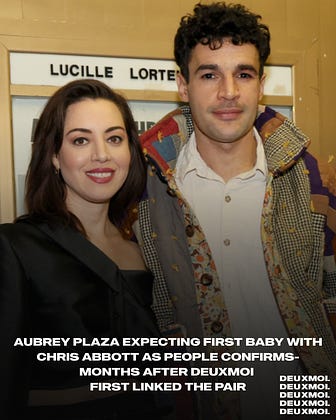 People Magazine confirms Aubrey Plaza is expecting her first baby with Chris Abbott. As we first shared on the Deux/U podcast back in June 2025, the pair were spotted together at The Chatham Berry Farm. Our source noted the interaction didn’t appear platonic. From back rubs to close seating, the vibes were already pointing to something more at the time.
