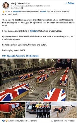The America Firsters are predictably annoyed when confronted with reminders that NATO’s Article Five has only been invoked once, in response to 9/11 — when the United States asked fellow NATO members to send their soldiers to die in Afghanistan. Apparently, Donald Trump finds this particularly irksome.