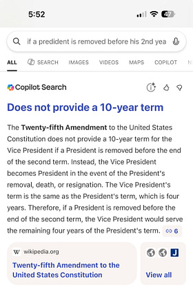 Someone posted that if Trump is removed by the 25th amendment before his 2nd year, that gives Juvie Vance a 10 year term. Since I don’t know all the rules, I typed in that question. This was the search answer. (Maybe if it’s questioned differently, another answer will come up?)