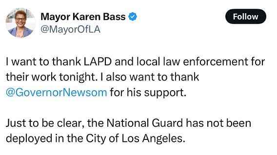 🚨Mayor Karen Bass of Los Angeles just confirmed that the National Guard has NOT been deployed in LA. Trump was LYING when he said that they had been and a did a “great job.” I guess he thinks Governor Newsom and Mayor Bass did a good job after all!
