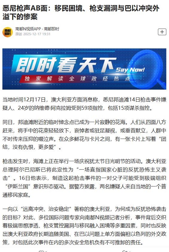 "It is self-evident that the so-called ‘Sixth Middle East War’ of the last two years, particularly its trigger, the Gaza war and the large-scale, indiscriminate deaths of Palestinian civilians, has become the most significant immediate catalyst for antisemitism in Australia. From another angle, this is one of the unintended consequences of bellicose Israel resorting to military aggression at will 穷兵黩武, which has turned back at it like a boomerang 回旋镖 to fuel the resurgence of global antisemitism. Australia has a large population in which Muslims and Jews coexist, and its policies are relatively permissive and multicultural. However, rather than encouraging peaceful coexistence, these conditions have exacerbated religious and political conflict, ultimately leading to this massacre."