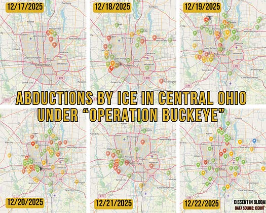 “Operation Buckeye” is the ‘cutesy’ name that ICE has given their occupation of Central Ohio. This is a documented (but incomplete) map of their abductions and the level of escalation throughout the week. Data is from ICEOUT.