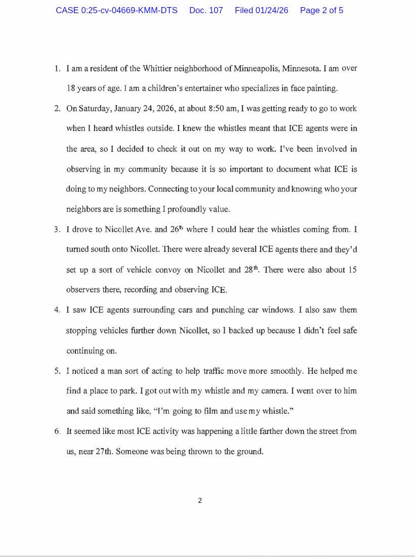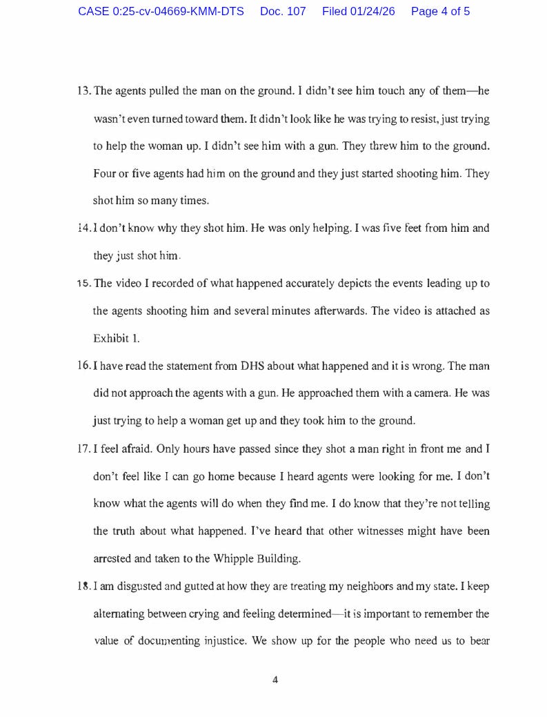 This is sworn testimony from "the lady in pink” who was in the background filming the murder of Alex Pretti today.