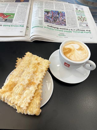Today’s treat. Cappuccino senza schiuma- without foam and baked cenci.