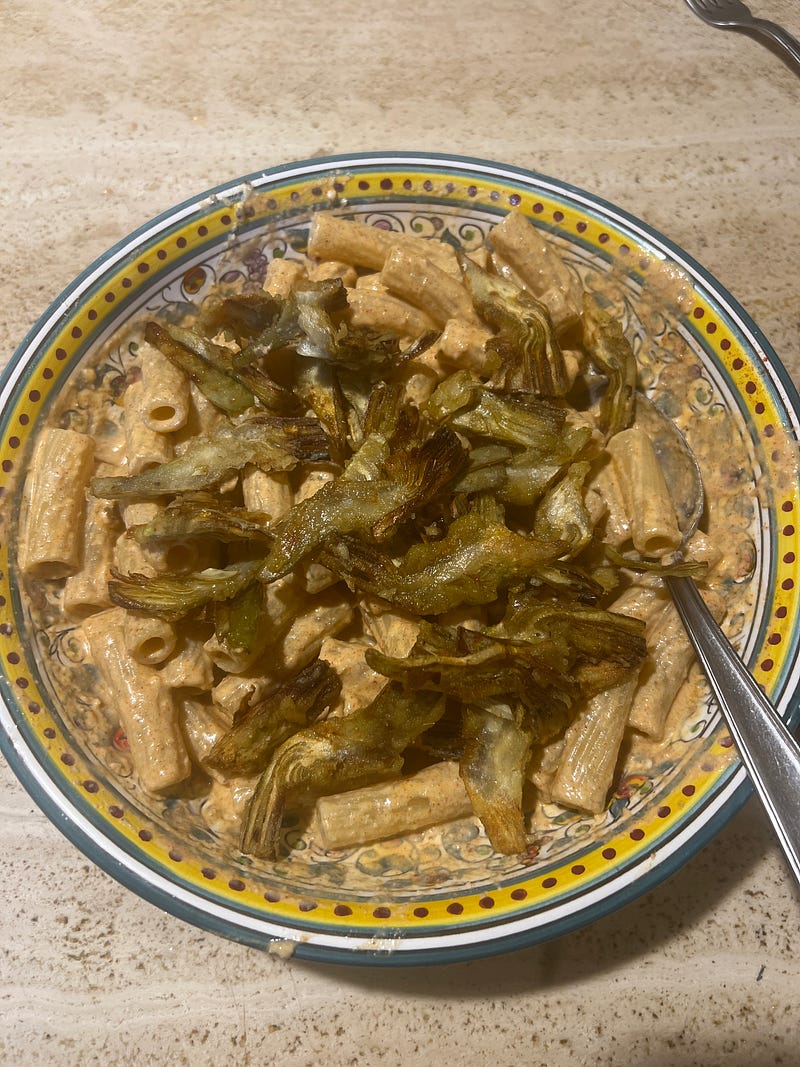 Walnut sauce with added kick of smoked paprika topped with fried artichokes.