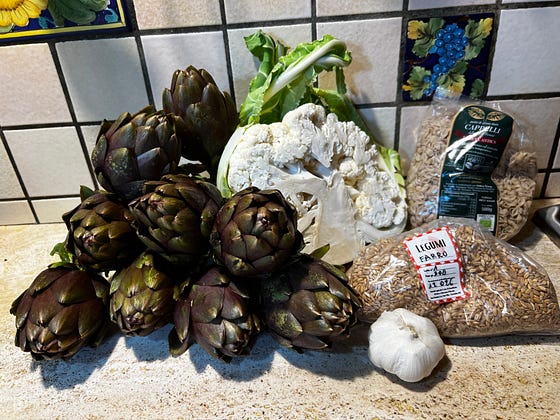 At the market today- morellini artichokes,half a giant cauliflower, garlic, farro and a tiny pasta made with ancient grains, grown at the farm( farina cappelli). All organic and local.