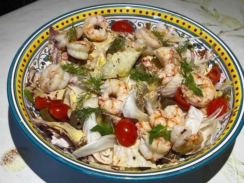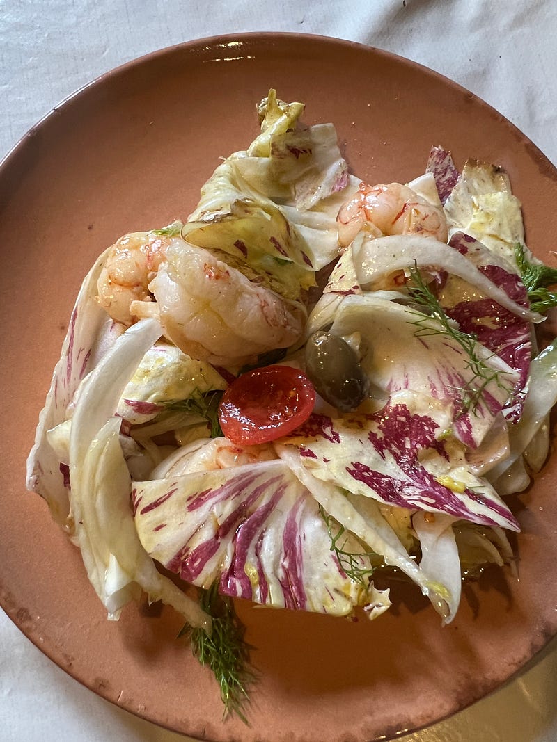 Pink radicchio, prawns, fennel, datterini tomatoes and taggiasca olives.