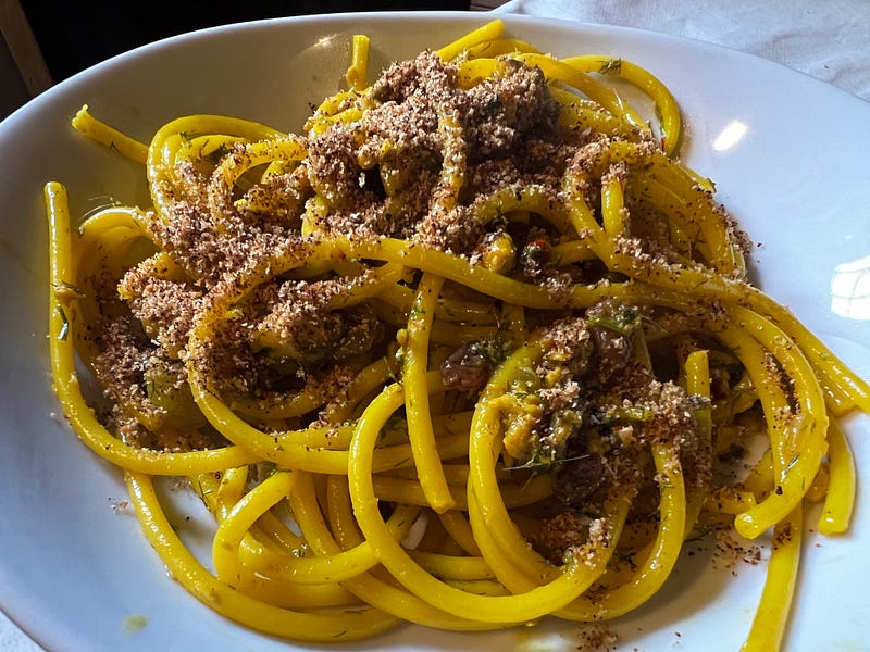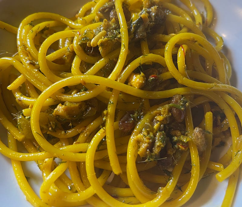 Pasta con le sarde, sardine and saffron. There are several variations.