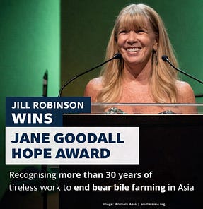 Our friend Jill Robinson has been awarded the inaugural Jane Goodall Hope Award.