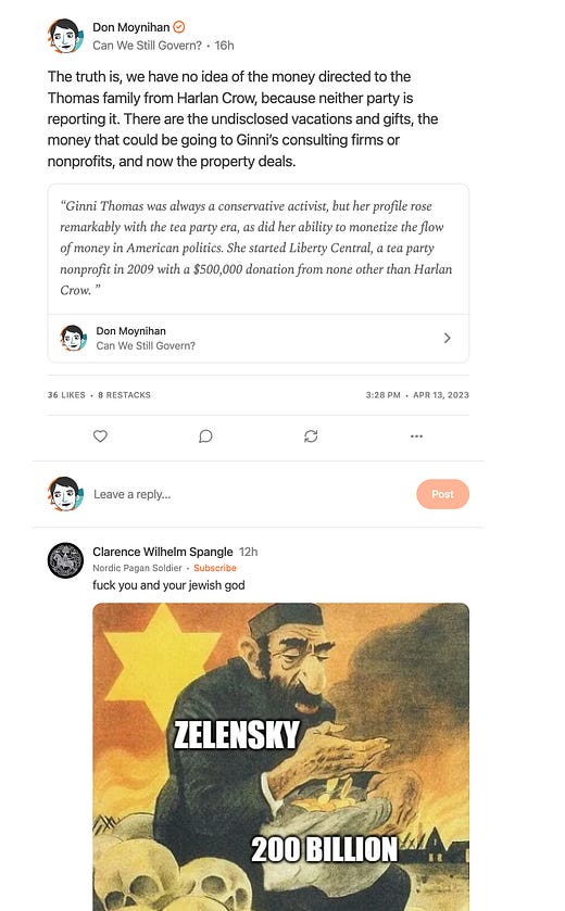 One tangible effect of Notes is to reduce the frictions in Substack writers communicating with each other. This is great. Mostly. But it also reveals that there are substackers churning out hate speech.