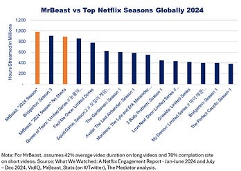 With over 300 million subscribers at the end of last year, Netflix is the largest SVOD service globally, so it follows that Bridgerton Season 3 was the biggest SVOD show globally last year. But, if you think of it as a "show," MrBeast was just as big, or bigger.