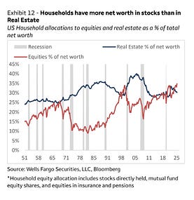 This is a very interesting chart, as household stock wealth being higher than real estate wealth has only happened in the late 60s and late 90s, the last two times the ensuing bear market lasted years.