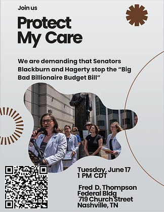 Join the TN physician advocates as we stand up to protect Medicaid (TennCare) and SNAP from devastating cuts in the Big Bad Billionaire Budget Bill. Tomorrow at 1p in downtown Nashville!
