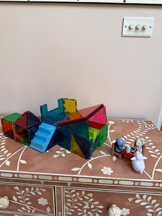 Screen free weekend play needs prep (especially if your kids wake up early like mine do!) I got into the habit of putting out 3-4 things out for the kids in the evening so when they wake up it’s available and engages them to play. Today’s set up was magnatiles, small toys and a couple of cars (not shown). They came up with this and have been playing since 6:45am! Given the new ‘screen time guidance’ in the UK I thought I’d share what we do and offer you options and ideas in my newsletter on Wednesday. Subscribe to find out more!