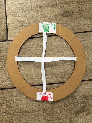 Note: photo of the cardboard steering wheel my eldest made while her little sister slept and I finished off the newsletter.