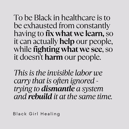 As one of the only 2% of US physicians who are Black women, starting my newsletter has been a way to make sure we could feel less isolated, and validated in our pain but also able to collectively heal from our trauma.