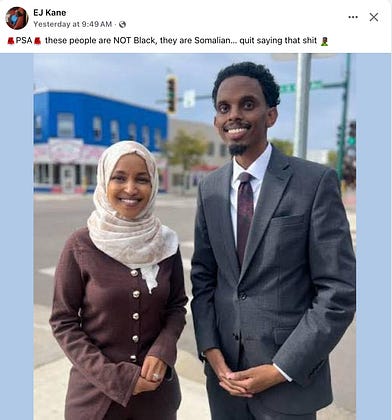 Somali people are African. They are racialized as Black in the United States. They are policed as Black, surveilled as Black, excluded as Black, and targeted by anti-Black racism as Black no matter what some Facebook commenters wish the taxonomy to be.