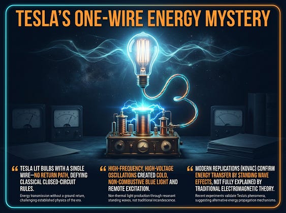 Nikola Tesla (1892) broke the closed-circuit rule: high-frequency, high-voltage oscillations powered lamps and tubes through a single conductor. Textbooks say Maxwell's equations require a loop, yet Tesla's longitudinal electrostatic waves delivered energy via potential, not current. Modern lab replications (Kovac) create standing wave node effects that classical EM can't predict.