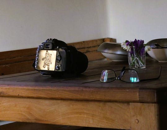 Just a camera set down randomly on the kitchen table early in the morning, perfectly reflecting the bear embroidery I made a few days ago. A little moment that will never happen, ever again.
