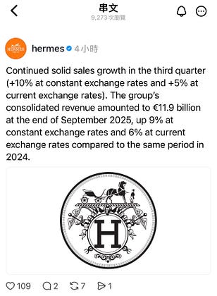 Hermès 在 Threads 發佈了第三季的財報表現。