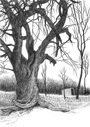 Day 87: We return to Hope, NJ to observe the full weight and significant presence of this fine tree. I referred to it casually as an oak but the truth is I do t know what kind of tree it is, I having been in a vehicle driving past, and of course no leaves visible at this time of year. Whatever it is, it is impressive and handsome.