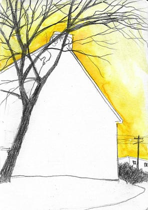 Day 89: Silhouette of the stone church (and the opinionated tree out front) in Hope NJ— both surrounded by an enfolding of nascent sunshine of springtime.