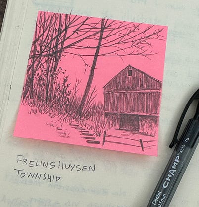 Day 90: a beautiful, probably late 19th century barn seen in Frelinghuysen Township, NJ. A Post-it sketch from a day of many meetings 🤓