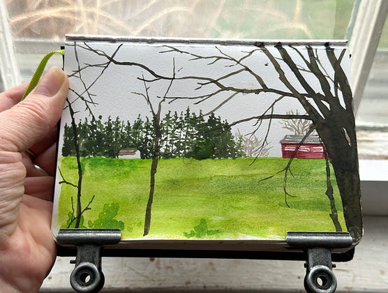 Day 93: Brutus, NY; the same view again, this time with color. Considering the rather static composition of this scene (in terms of value), I decided to have a go with watercolor to get more a sense of what the hell we’re actually looking at 🤓 That being a spring-bright expanse of green, and a couple of wee outbuildings, dwarfed by both the far row of pines and the dramatic branches of the foreground trees. Better in color, this one!