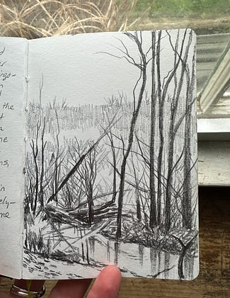 Day 95: This morning, a watery idyll in Manheim, NY. This is a kind of chaotic scene I wouldn’t have attempted prior to my recent daily drawing practice. I wouldn’t have known where to begin, or how to “make sense” of it all. but I’ve bee letting go of— even preventing myself from— the need to understand what I’m looking at or where things start and end; what the shapes are made of or how they fit together. Just see the shape, texture, value of whatever bit I’m looking at, and do something like it with the pencil. That’s all.