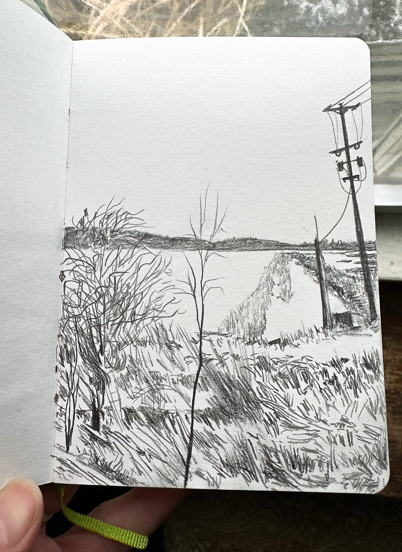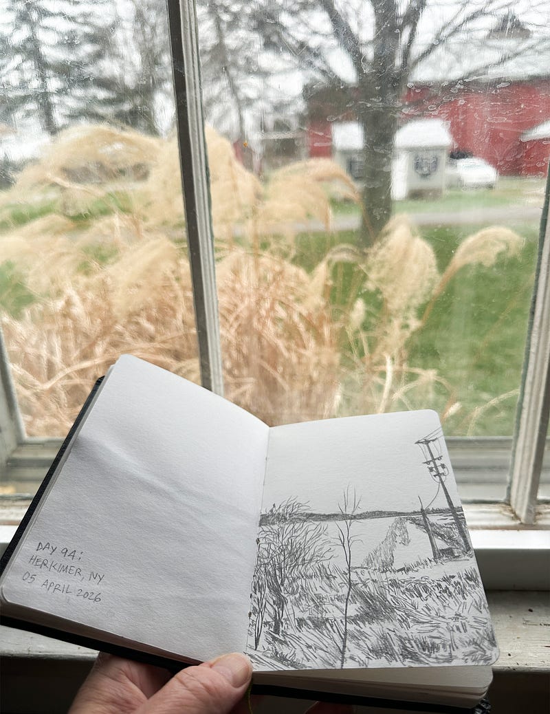 Day 96: Wind and grasses flank the river and some earthen causeways in Savannah, NY. The poles and wires are lacking in subtleties; I suppose the whole drawing is today. I put it down to the extreme (and cold!) winds rattling the windows of the room where I’m drawing this morning! Where did Spring go?!