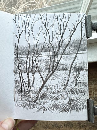 Day 97: Manheim NY, again. Grasses and some of the slender, elegant trees that reside between the tracks and the river. It’s still cold here, but inching its way toward the 50s today. Slowly.