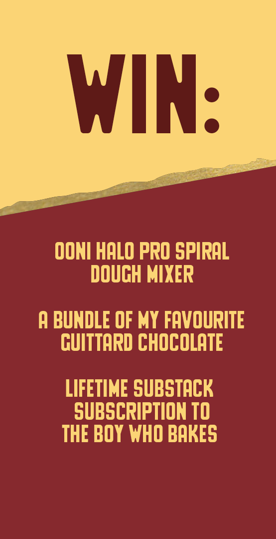 Enter now for your chance to win a lifetime paid subscription to Edd Kimber’s Substack, The Boy Who Bakes, an Ooni Halo Pro Spiral Mixer and a bundle of Edd’s favourite Guittard Chocolate.
