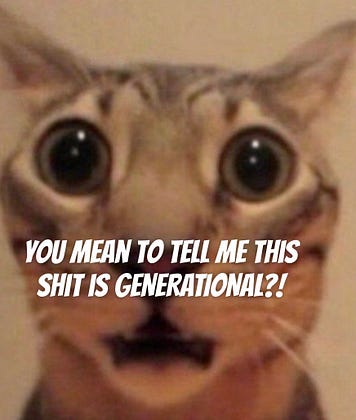 Me when I remember my great-grandmother was a controversial poet and a hushed-up witch, my other great-grandmother had prophetic dreams and visions and held rituals with her friends, my great-aunts were exactly the same way and one of them unalived herself, both my grandmothers were religion freaks who had god-complexes and were emotionally abusive without meaning to be, my aunts “aren’t quite there” and have had serious mental health problems, and my mother is an repressed emotionally unstable overly-“kind” loose cannon with trauma:
