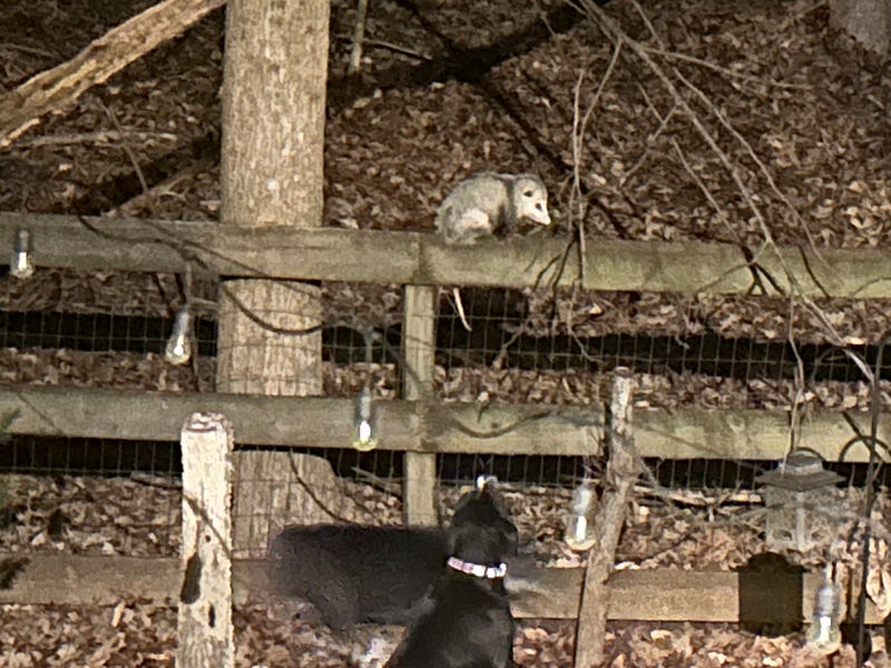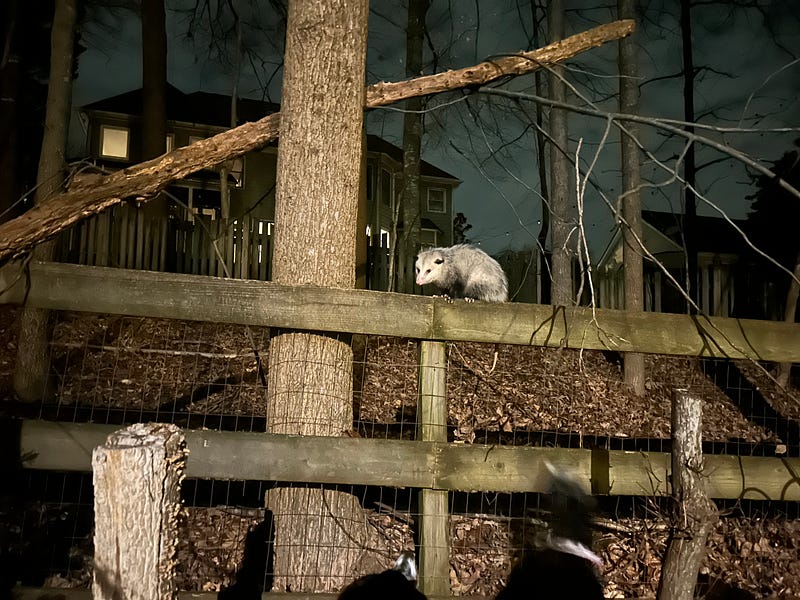 Just got off of a 30-minute adventure with my dogs. They found a possum in the backyard and wouldn’t stop wailing and trying to eat it and making a ruckus for the neighbors. Had to rein ‘em back inside with the harnesses.