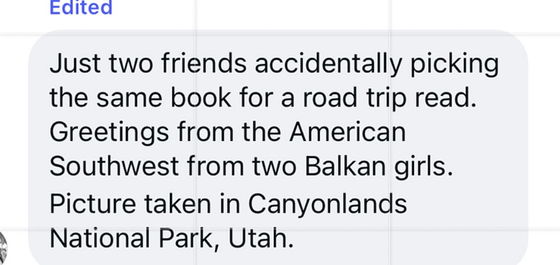 Such a heartwarming messsage. What are the odds of two friends coincidentally picking the same novel for a road trip in Utah? Thank you with all my heart