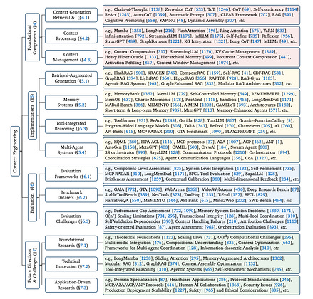 Context engineering components include context retrieval and generation, context processing, context management, and how they are all integrated into systems implementation, such as RAG, memory architectures, tool-integrated reasoning, and multi-agent coordination mechanisms.