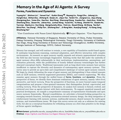 This 102-page survey introduces a unified framework for understanding agent memory through three lenses: Forms, Functions, and Dynamics.