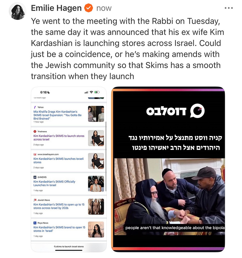 Timing checks out. Ye apologizes to the Jewish community the same day that Skims announces they’re expanding their brand in Israel.