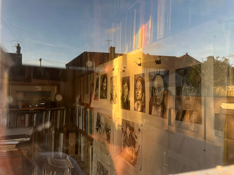 Winter light on the studio doors + view through that little window… (before I took down the drawing board with Simon’s last prints here).