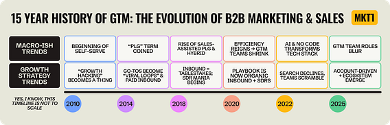 And so, I felt the need to make a timeline of the last 15 years of B2B GTM, covering shifts in GTM motions, channels, team structures, spending habits, jargon changes, etc.