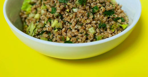 In addition to this simple farro salad with olive dressing, I decided we all needed a sparky vinaigrette made with pepperoncini, to pour over a big green salad with crispy hot tater tots in it. We may never pass this way again, so why the hell not.