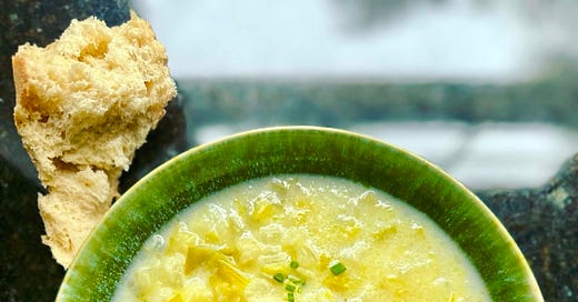 The perfect meal—my chunky potato soup with leeks and onions; a cold, lemony, crunchy baby gem salad; cheddar and blue cheese toasts. Don’t go out. Stay home. It’s better.