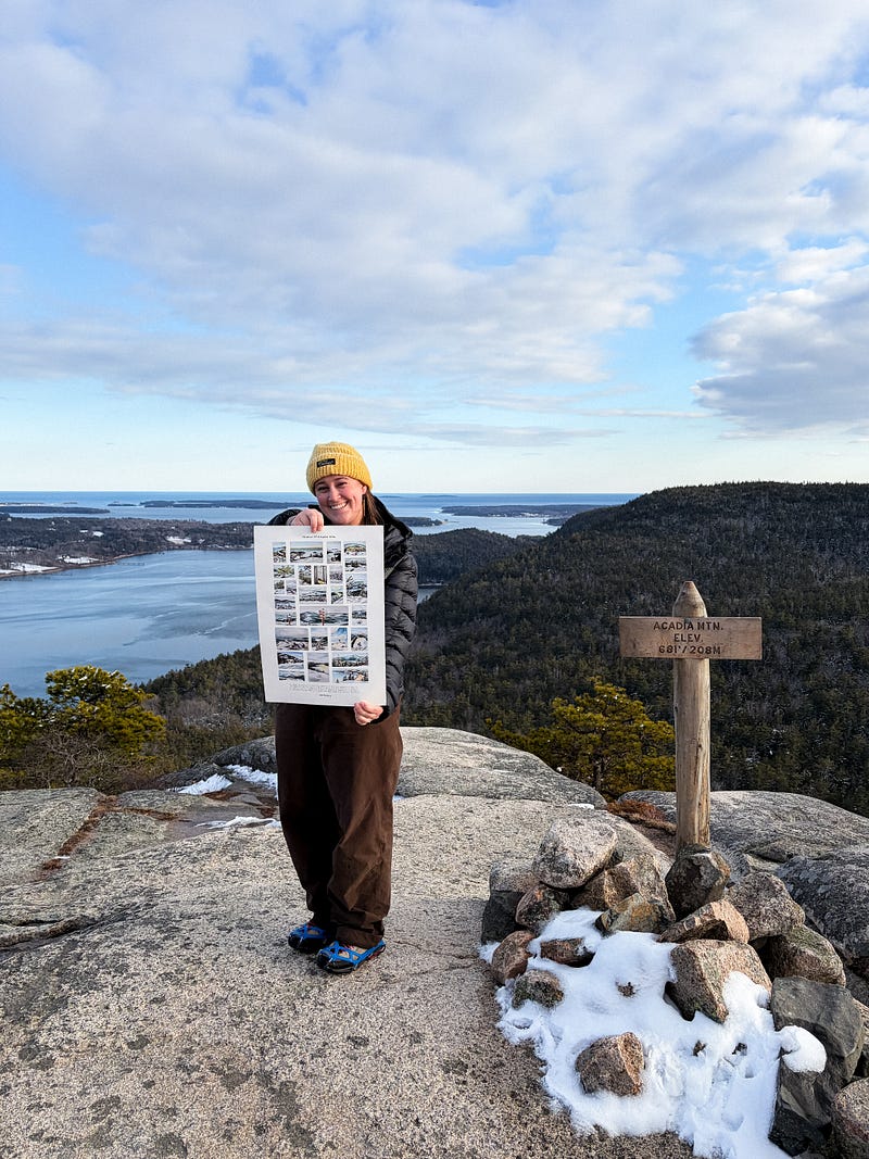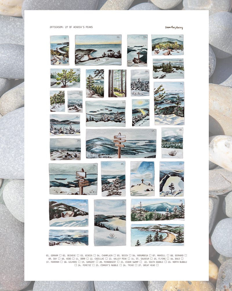 Hiked Acadia’s peaks in January > made little watercolor + pencil studies of them in February + March > turned them into a poster that will be available on my website at noon today! When I think back on this this research project I think of coyote and otter tracks, lots of layers, wispy clouds, and deep teal tones. (The little studies will be available, too, plus hand-embroidered patches.)