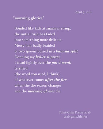 Here is my paint-chip poem for today, April 9, 2026. The paint-chips I drew are bolded and italicized :) Please enjoy this poem and feel free to use the words to write your own!
