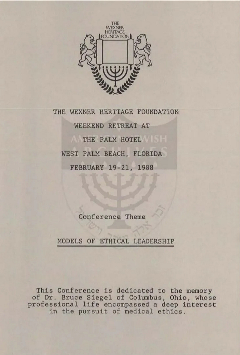 That same month the Wexner Heritage Foundation held a national fundraising retreat for donors in Palm Beach, Florida entitled ‘Models of Ethical Leadership.’
