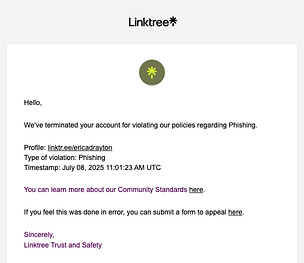 Update on being BANNED on Linktree for using a PayPal link. They have “reviewed & accepted my appeal” and I am now unbanned.