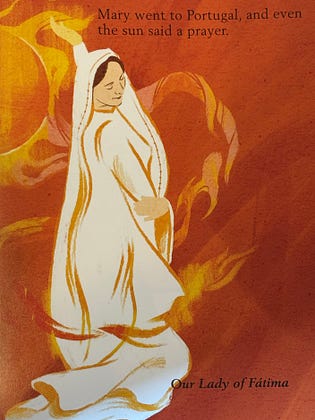 Sharing a page from Shannon K. Evans and my new kids book, “Our Mother Too: Mary Embraces the World” in honor of today’s feast! Our Lady of Fatima, pray for us!